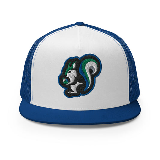 Raleigh Squirrel Trucker Cap in Blue, Black, Green, Gray, and White